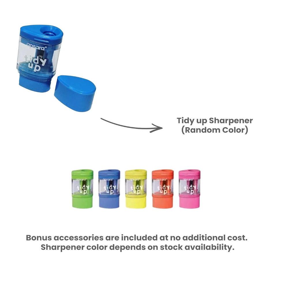 - Free tidy-up sharpener colour may vary and will be sent based on availability, function remains the same